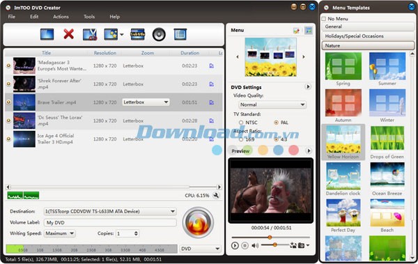 Không chỉ dừng lại ở việc ghi các file video thông dụng ra đĩa DVD-video, ImTOO DVD Creator còn có khả năng tạo file ảnh ISO và thư mục DVD từ nhiều nguồn video khác nhau.