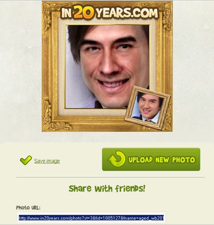 Để lưu hình ảnh kết quả, hãy nhấn vào Save image. Nếu bạn muốn thử với một ảnh khác, hãy truy cập mục Upload New Photo và lặp lại các bước tương tự. Mục Photo URL cho phép bạn tạo liên kết để chia sẻ ảnh đã xử lý với bạn bè. Việc chọn Yes ở mục Drug Addict sẽ khiến khuôn mặt trông già nua và nhiều nếp nhăn hơn.