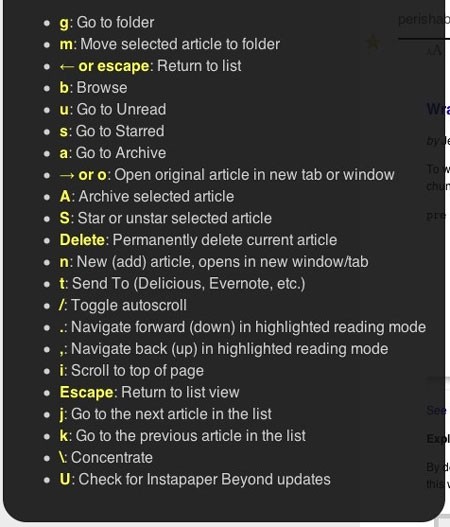 Sau khi cài đặt, bạn chỉ cần nhấn phím “h” khi đang đăng nhập vào Instapaper để xem danh sách đầy đủ các phím tắt và lệnh điều khiển.