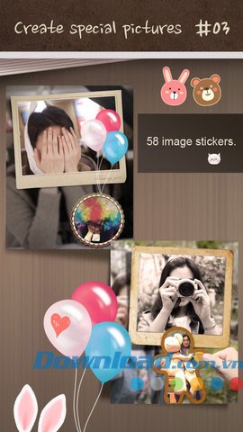 Ứng dụng sở hữu bộ sưu tập 58 sticker đáng yêu, đa dạng, cho phép bạn tùy biến ảnh theo phong cách cá nhân.