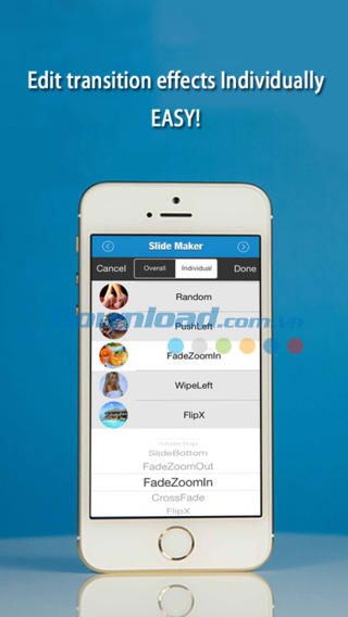 Điều thú vị là, với InstaVideo Free for iOS, bạn có thể tùy chỉnh hiệu ứng chuyển ảnh cho từng ảnh riêng lẻ hoặc áp dụng cho toàn bộ video. Ứng dụng cung cấp tổng cộng 18 hiệu ứng chuyển ảnh khác nhau, cho phép bạn cá nhân hóa từng khung hình.