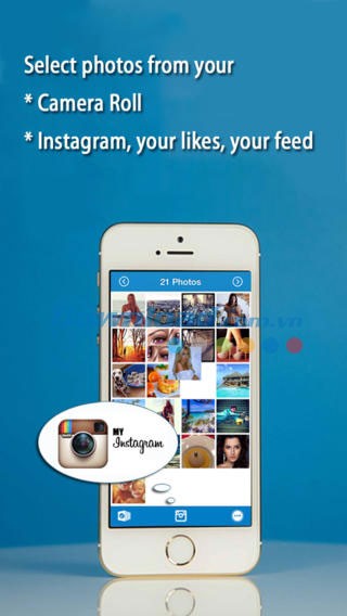 Ứng dụng cho phép người dùng lựa chọn hình ảnh từ thư viện ảnh của thiết bị hoặc trực tiếp từ tài khoản Instagram cá nhân.