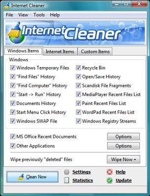 Internet Cleaner loại bỏ dấu vết của các ứng dụng nhắn tin, email, tin tức, P2P và các phần mềm miễn phí, giải phóng không gian đĩa cứng bằng cách xóa các tập tin và mảnh vụn scandisk.