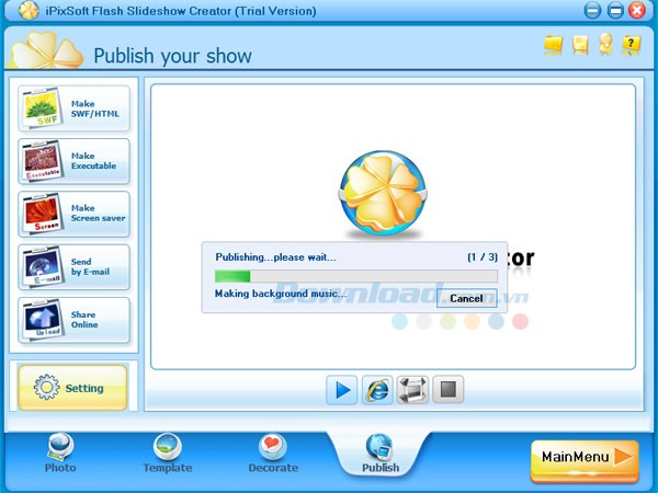 Ngoài ra, iPixSoft Flash Slideshow Creator còn cho phép người dùng xuất các tập tin ở nhiều định dạng khác nhau như SWF, HTML, screensaver, hoặc chia sẻ trực tiếp lên máy chủ của phần mềm.