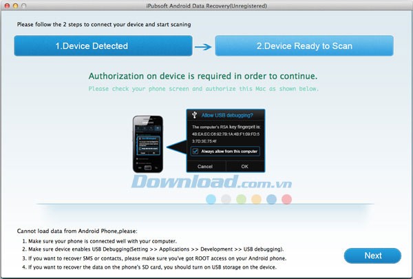 Sau khi hoàn thành các thiết lập, trở lại giao diện chương trình trên máy Mac và chọn “Cho phép” trong cửa sổ thông báo hiển thị trên điện thoại. Sau đó, chương trình sẽ tự động phát hiện và quét thiết bị Android của bạn.