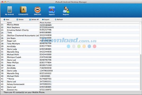 Phần mềm này hỗ trợ người dùng sao lưu và khôi phục dữ liệu từ thiết bị Android, đồng thời cho phép nhập/xuất các tập tin đa phương tiện như nhạc, hình ảnh, video. Bên cạnh đó, bạn có thể gửi và nhận tin nhắn SMS, quản lý danh bạ, cũng như thực hiện cài đặt và gỡ bỏ ứng dụng trực tiếp trên hệ điều hành Mac OS X.