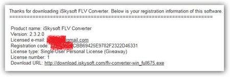 Kiểm tra hộp thư đến của bạn và tìm kiếm email có tiêu đề Your Registration Information of iSkysoft FLV Converter. Bên trong email này, bạn sẽ tìm thấy mã kích hoạt bản quyền của sản phẩm, như được minh họa dưới đây: