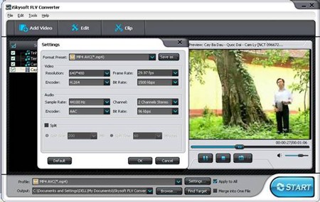 Chương trình hỗ trợ chuyển đổi sang hơn 20 định dạng video và audio khác nhau. Bạn có thể chọn định dạng mong muốn từ mục Profile. Sau khi chọn định dạng, nhấn vào Settings để tùy chỉnh các thông số kỹ thuật cho phù hợp với nhu cầu của bạn. Nhấn OK để lưu các thay đổi hoặc Default để khôi phục cài đặt mặc định.