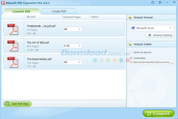Phần mềm cho phép xử lý đồng thời tối đa 200 file PDF, giúp tiết kiệm thời gian đáng kể khi cần kết hợp nhiều tài liệu. Bạn cũng có thể tùy chọn chỉ chuyển đổi một số trang cụ thể trong tài liệu.