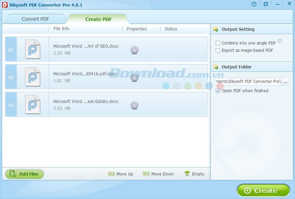 Đầu tiên, bạn hãy chọn tab Create PDF. Tiếp theo, nhấp vào nút Add Files để tải lên những file PDF mà bạn muốn áp dụng bảo mật.