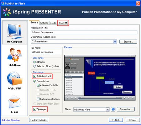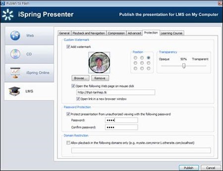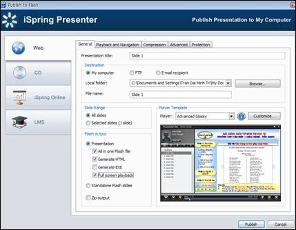 Để tùy biến các thông số trước khi đóng gói, hãy nhấp vào nút Publish. Hộp thoại Publish to Flash bao gồm bốn phần tính năng chính: Web, CD, iSpring Online (tương tự các phiên bản iSpring Presenter trước) và thẻ LMS (hỗ trợ đóng gói bài trình diễn theo các chuẩn bài dạy trực tuyến mới nhất).
