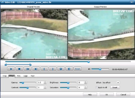 Tại đây, bạn có thể thực hiện các thao tác như lật ngược, xoay trái, xoay phải, thu nhỏ hoặc phóng to khung hình (Crop), điều chỉnh độ sáng, độ tương phản, gamma, và điều chỉnh âm lượng (Effect).