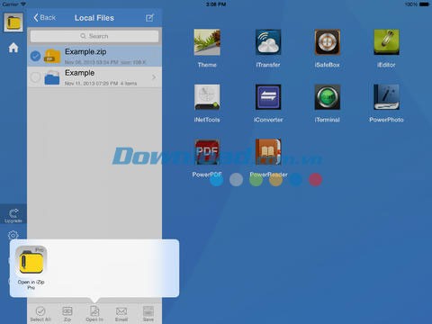 iZip for iOS cho phép mở các tập tin trong các ứng dụng khác đã được cài đặt trên thiết bị.