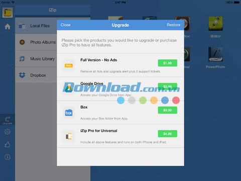 iZip for iOS hỗ trợ gửi và tải tập tin từ/tới Dropbox .
