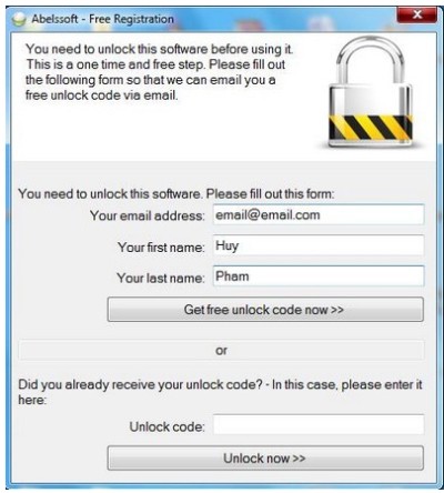 Sau khi tải xuống và cài đặt, khi khởi động lần đầu, một hộp thoại sẽ yêu cầu bạn đăng ký bản quyền. Tại hộp thoại này, bạn nhập địa chỉ email, họ tên và nhấn vào nút Get free unlock code now.