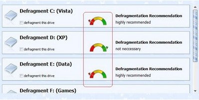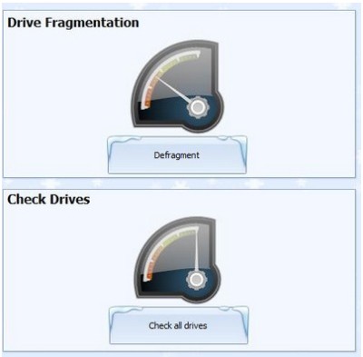 - : Chống phân mảnh bộ nhớ, giúp tối ưu và tăng tốc độ truy xuất bộ nhớ. Tuy nhiên, tính năng này chỉ có trong phiên bản Ultimate và không được cung cấp trong phiên bản Professional. Khi nhấn vào nút Defragment tại mục Drive Fragmentation, phần mềm sẽ yêu cầu bạn chọn phân vùng ổ cứng muốn chống phân mảnh. Bên cạnh mỗi phân vùng, sẽ hiển thị một biểu tượng đồng hồ. Với những phân vùng có kim đồng hồ chỉ vào màu đỏ, đó là phân vùng bạn nên tiến hành chống phân mảnh. Ngược lại, nếu chỉ vào màu xanh, phân vùng đó đang hoạt động ổn định và không cần can thiệp.