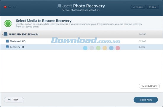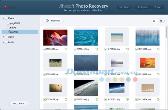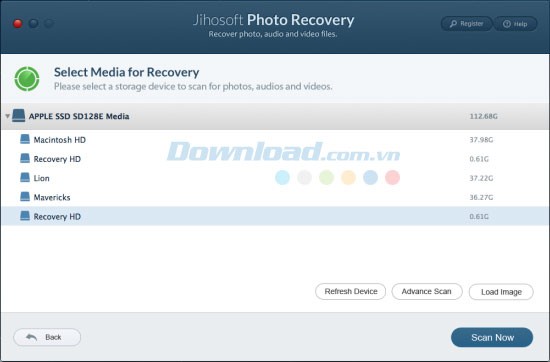 Jihosoft Photo Recovery for Mac thực hiện quét toàn bộ ảnh, video và audio trong thiết bị lưu trữ. Sau quá trình quét, bạn có thể xem trước các file tìm thấy. Hãy kiểm tra kỹ lưỡng và chọn những file cần thiết để phục hồi từ danh sách kết quả.