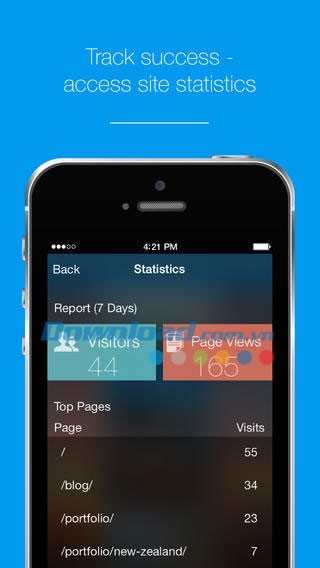 Người dùng Jimdo Pro và Jimdo Business có thể theo dõi các số liệu thống kê trang web của mình ngay trên ứng dụng. Xem số lượng người truy cập, số lượt xem trang và các trang phổ biến nhất trong những ngày gần đây, 7 ngày qua và 30 ngày gần nhất.