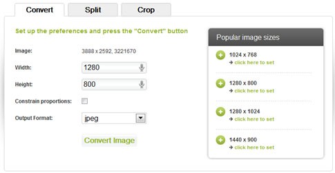 Sau khi tải ảnh lên, ba tab chính là Convert, Split và Crop sẽ hiển thị. Tab Convert cho phép bạn thay đổi kích thước của ảnh. Hãy nhập kích thước mong muốn cho ảnh xuất ra bằng cách điền số vào các ô Width và Height.