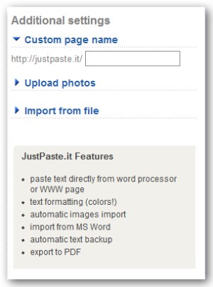 JustPaste.it còn có Sidebar, nơi bạn có thể tạo địa chỉ trang riêng, tải lên hình ảnh và nhập tập tin.