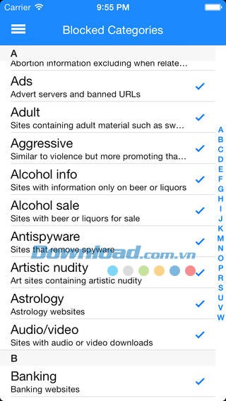 Việc sử dụng mục “các danh mục bị khóa” cho phép lựa chọn các danh mục trang web để chặn. Tính năng này giúp khóa hàng ngàn trang web không mong muốn cùng một lúc.