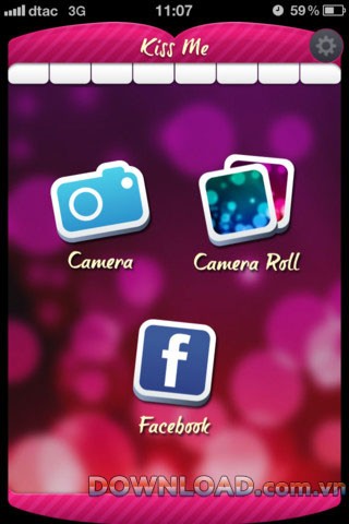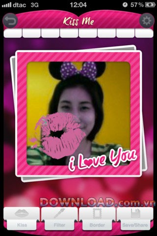 - Ứng dụng cho phép người dùng gửi những nụ hôn ảo lên ảnh chụp từ camera, ảnh có sẵn trong thư viện hoặc ảnh đại diện trên Facebook.