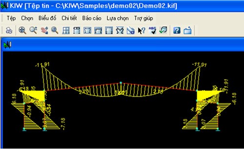 KIW trực quan hóa kết quả thông qua sơ đồ kết cấu, tải trọng, chuyển vị, biểu đồ nội lực và sơ đồ tiết diện. Người dùng có thể xem, in ấn và điều chỉnh các kết quả này trực tiếp trên giao diện đồ họa, cùng với báo cáo chi tiết về từng phần tử và liên kết.