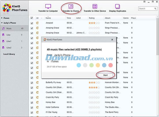 Xác nhận và nhấn Start để bắt đầu quá trình chuyển file sang iTunes. Sau đó, mở iTunes để kiểm tra các file nhạc vừa chuyển.