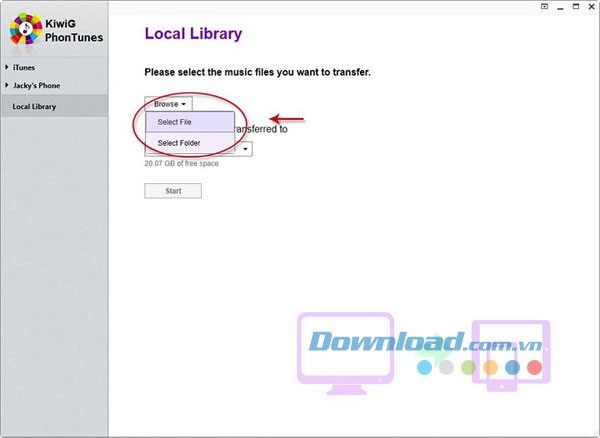 Nhấn Browse và chọn File hoặc Folder chứa các tập tin nhạc được lưu trữ trên máy tính.