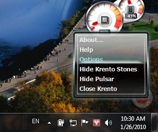 Sau khi hoàn tất quá trình cài đặt, một biểu tượng vòng tròn xoáy màu đỏ sẽ xuất hiện ở góc dưới bên phải màn hình. Để tùy chỉnh các thiết lập cho Krento, bạn có thể nhấp chuột phải vào biểu tượng này và chọn Options.