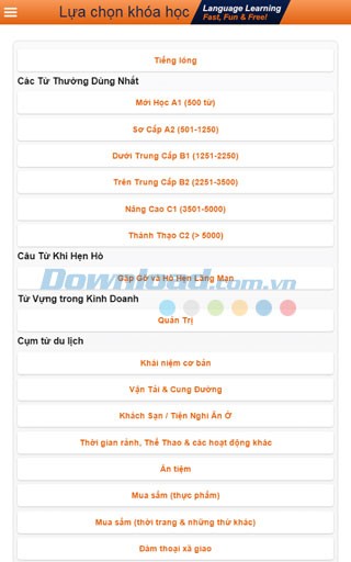 Ứng dụng cung cấp đa dạng các khóa học, bao gồm các cụm từ thường dùng trong du lịch, từ vựng tiếng Anh phổ biến, tiếng lóng hiện đại, tiếng Anh chuyên ngành Thương mại, và thậm chí là những lời tán tỉnh hữu ích.