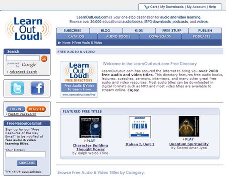 LearnOutLoud.com gây ấn tượng với giao diện thu hút và là một nguồn tổng hợp sách nói phong phú. Trang web này cung cấp hơn 25.000 tựa sách nghe và video, bao gồm cả nội dung miễn phí và trả phí.