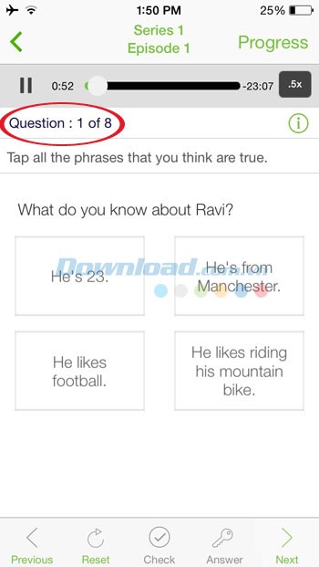Sau mỗi bài nghe, ứng dụng cung cấp các bài kiểm tra để đánh giá mức độ hiểu bài của người học. Các bài kiểm tra này bao gồm cả câu hỏi và đáp án chi tiết.