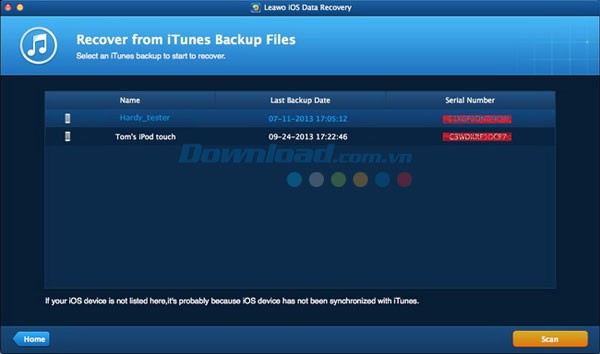 Sau khi cài đặt phần mềm trên máy tính MacBook, hãy khởi động chương trình. Chương trình sẽ hỏi bạn muốn khôi phục dữ liệu từ thiết bị iOS trực tiếp hay từ bản sao lưu iTunes. Chọn tùy chọn tương ứng và nhấn nút "Start" để bắt đầu quá trình quét nhanh.