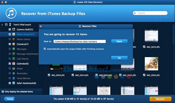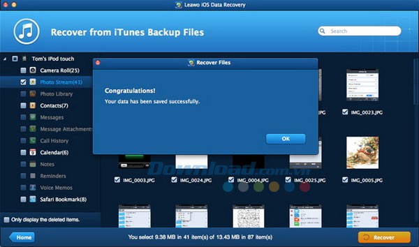 Leawo iOS Data Recovery hỗ trợ người dùng khôi phục 12 loại dữ liệu khác nhau từ các bản sao lưu iTunes, tương thích với mọi thiết bị iOS. Các loại dữ liệu này bao gồm: ảnh chụp từ cuộn máy ảnh, Photo Stream, thư viện ảnh, tin nhắn, danh bạ, tệp đính kèm tin nhắn, bản ghi âm giọng nói, lịch sử cuộc gọi, lịch hẹn, ghi chú, nhắc nhở và các dấu trang trong trình duyệt Safari.