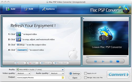 Leawo Mac PSP Converter là một giải pháp chuyên nghiệp để chuyển đổi video sang định dạng PSP trên hệ điều hành Mac. Công cụ này giúp bạn dễ dàng chuyển đổi nhiều định dạng video khác nhau, bao gồm MOV, 3GP, AVI, MPEG và ASF, thành file video MP4 tương thích với PSP và PS3 Video MPEG-4, đồng thời đảm bảo chất lượng hình ảnh đầu ra cao.