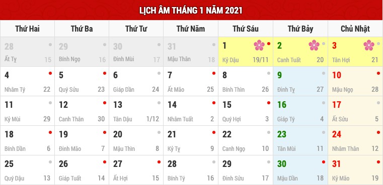 Lịch âm tháng 1 và các ngày lễ trong tháng