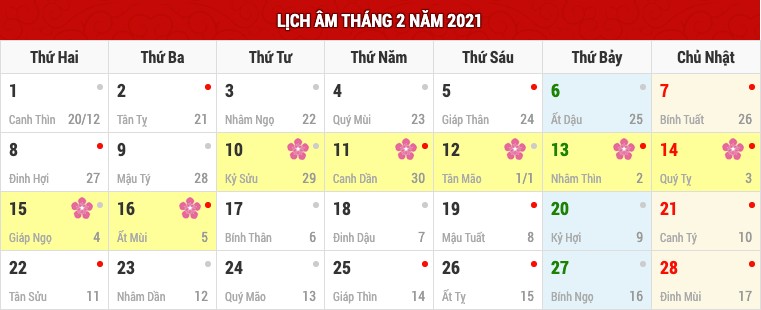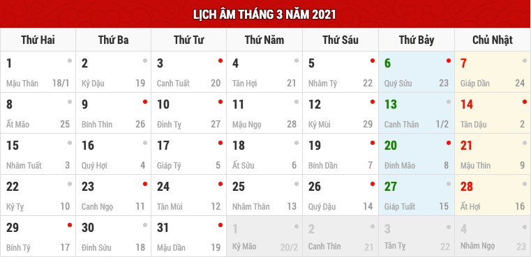 Nhằm đáp ứng nhu cầu tìm kiếm thông tin của đông đảo độc giả, chúng tôi xin trình bày lịch âm hàng tháng, kèm theo danh sách các ngày nghỉ lễ quan trọng. Các ngày được đánh dấu màu đỏ biểu thị ngày Hoàng đạo, còn màu xám tượng trưng cho ngày Hắc đạo.