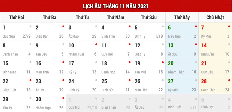 Lịch âm tháng 11 và các ngày lễ trong tháng