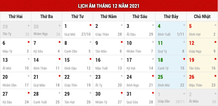 Lịch âm tháng 12 và các ngày lễ trong tháng