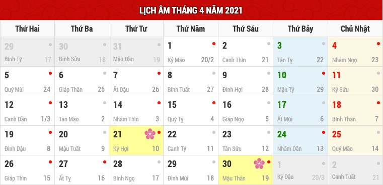 Lịch âm tháng 4 và các ngày lễ trong tháng
