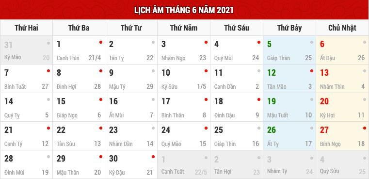 Lịch âm tháng 6 và các ngày lễ trong tháng