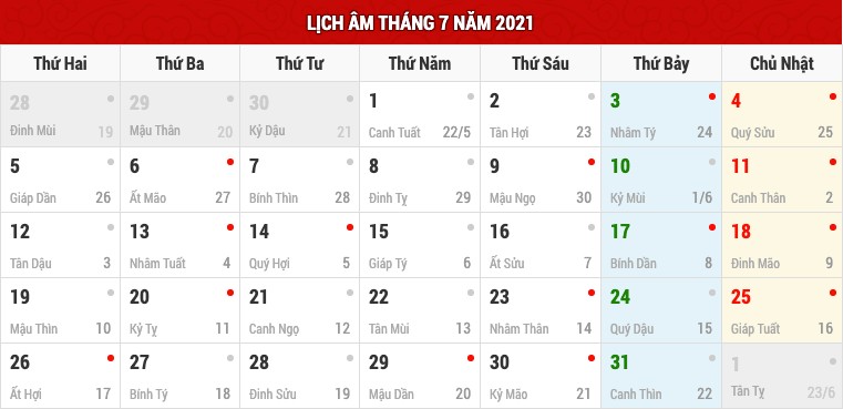 Lịch âm tháng 7 và các ngày lễ trong tháng