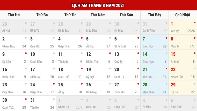 Lịch âm tháng 8 và các ngày lễ trong tháng