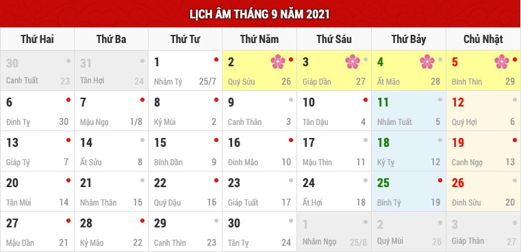Lịch âm tháng 9 và các ngày lễ trong tháng