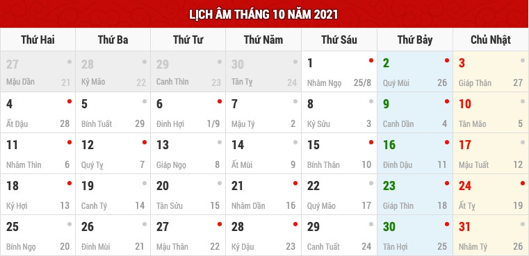 Lịch âm tháng 10 và các ngày lễ trong tháng