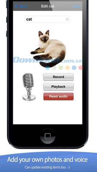 Mọi mục đều có thể được tùy biến toàn diện về nội dung chữ, âm thanh và hình ảnh minh họa. Bạn thậm chí có thể thêm ảnh cá nhân của trẻ để dạy bé cách đánh vần tên mình.