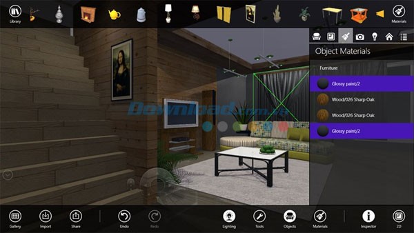 Chương trình cung cấp hơn 1.500 vật liệu khác nhau để bạn có thể sơn tường và bọc vỏ cho nội thất chỉ bằng cách kéo và thả vật liệu lên đối tượng mong muốn.