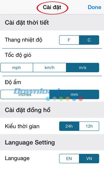 Bạn có thể tùy chọn hiển thị nhiệt độ theo độ C hoặc F, tầm nhìn theo dặm hoặc km.