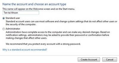 - Để tạo một tài khoản người dùng mới, nhấn chọn mục Manage another account rồi chọn tiếp Creat new account. Sau đó điền tên người dùng và quyền truy cập (tài khoản Administrator hoặc tài khoản khách).